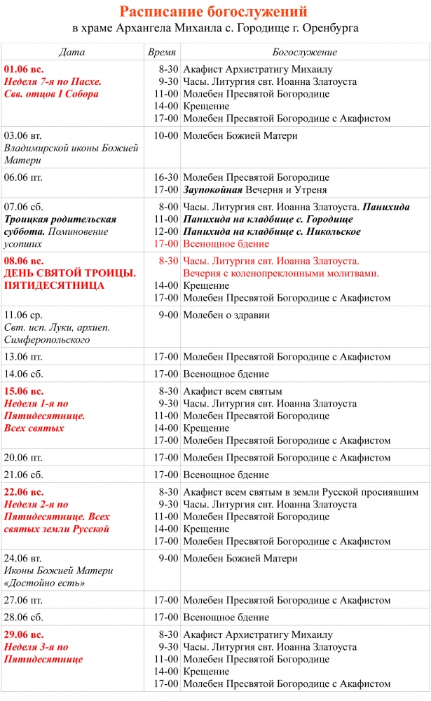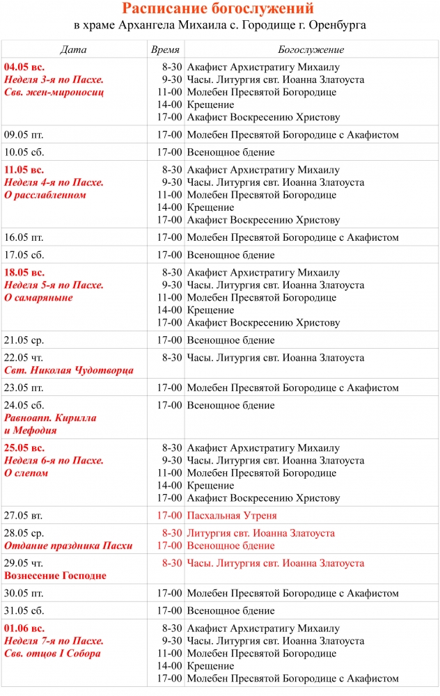 Во время Великого Поста, Пасхальной седмицы, или, если в указанные дни выпадают великие и двунадесятые праздники, расписание может меняться. Текущее расписание указано ниже!